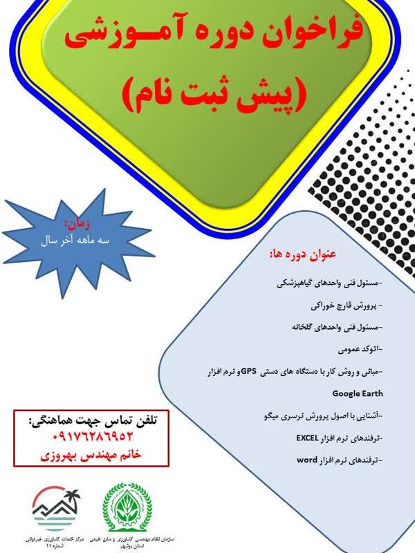 به اطلاع علاقمندان به ثبت نام در دوره های آموزشی سازمان نظام مهندسی کشاورزی و منابع طبیعی استان بوشهر می رساند جهت انجام مراحل پیش ثبت نام و کسب اطلاعات بیشتر در خصوص دوره های آموزشی تا پایان سال، با خانم مهندس بهروزی مجری مرکز خدمات کشاورزی غیر دولتی شماره 11 تماس حاصل فرمایند. خانم مهندس بهروزی :09176286952 براي اطلاع از آخرين اخبار ، فراخوان هاي شروع ثبت نام دوره ها و اطلاعيه هاي بروز ، راه های ارتباطی سازمان را دنبال فرمائید.