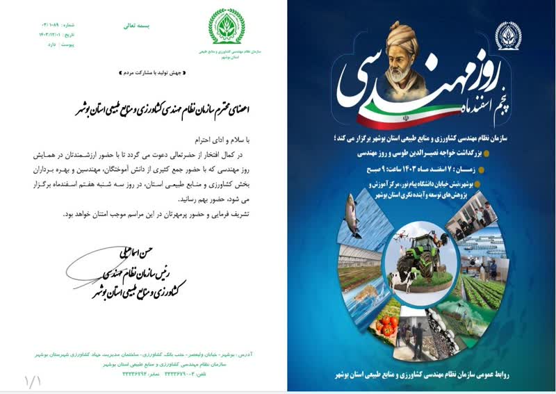 از این رو با کمال افتخار از کلیهی اعضای محترم، کارشناسان، مهندسین، بهره برداران و فرهیختگان بخش کشاورزی و منابع طبیعی استان دعوت به عمل میآید در همایش روز مهندسی شرکت فرمایند.