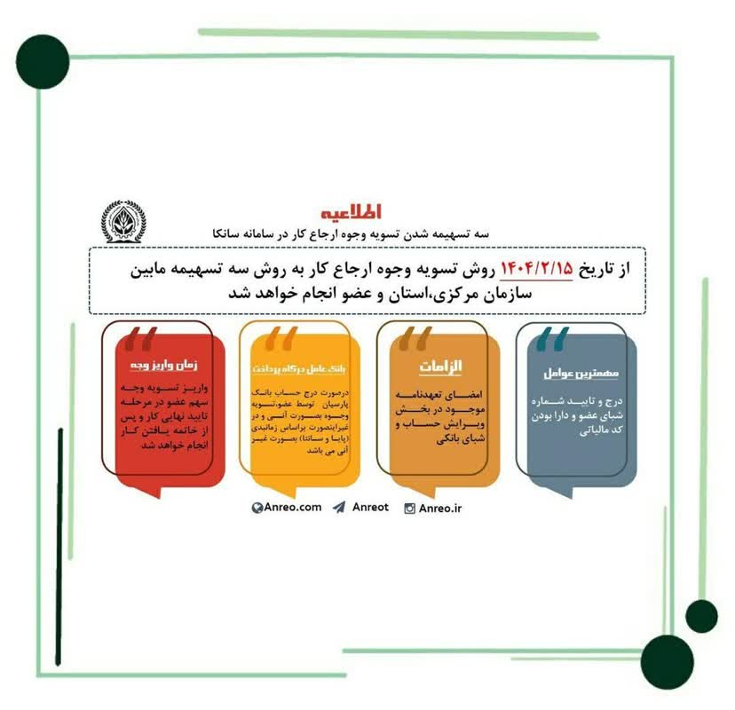 بديهي است مهمترين عامل در روش سه تسهيمه وجود شماره شباي عضو در سامانه سانكا مي باشد كه اين امر قبلا به اطلاع اعضا رسانده شده است و تاكيد ميشود نياز به درج شماره شبا و دارا بودن كد مالياتي از مهمترين الزامات آن مي باشد.