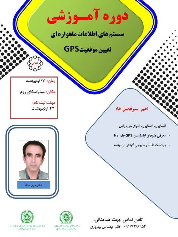 سازمان نظام مهندسی کشاورزی و منابع طبیعی استان بوشهر برگزار می کند : دوره آموزشی سیستم های اطلاعاتی ماهواره ای تعیین موقعیت GPS مدرسین دوره : دکتر پرویز بیات شروع دوره : ۲۴ اردیبهشت ماه مهلت ثبت نام : ۲۲ اردیبهشت ماه نحوه ثبت نام برای کارشناسان عضو در سامانه سانکا: ورود به کارتابل عضویت در سامانه سانکا«sanka.agrieng.org»_ سامانه آموزش_ لیست دوره ها *شماره تماس جهت هماهنگی : 09176286952 خانم مهندس بهروزی