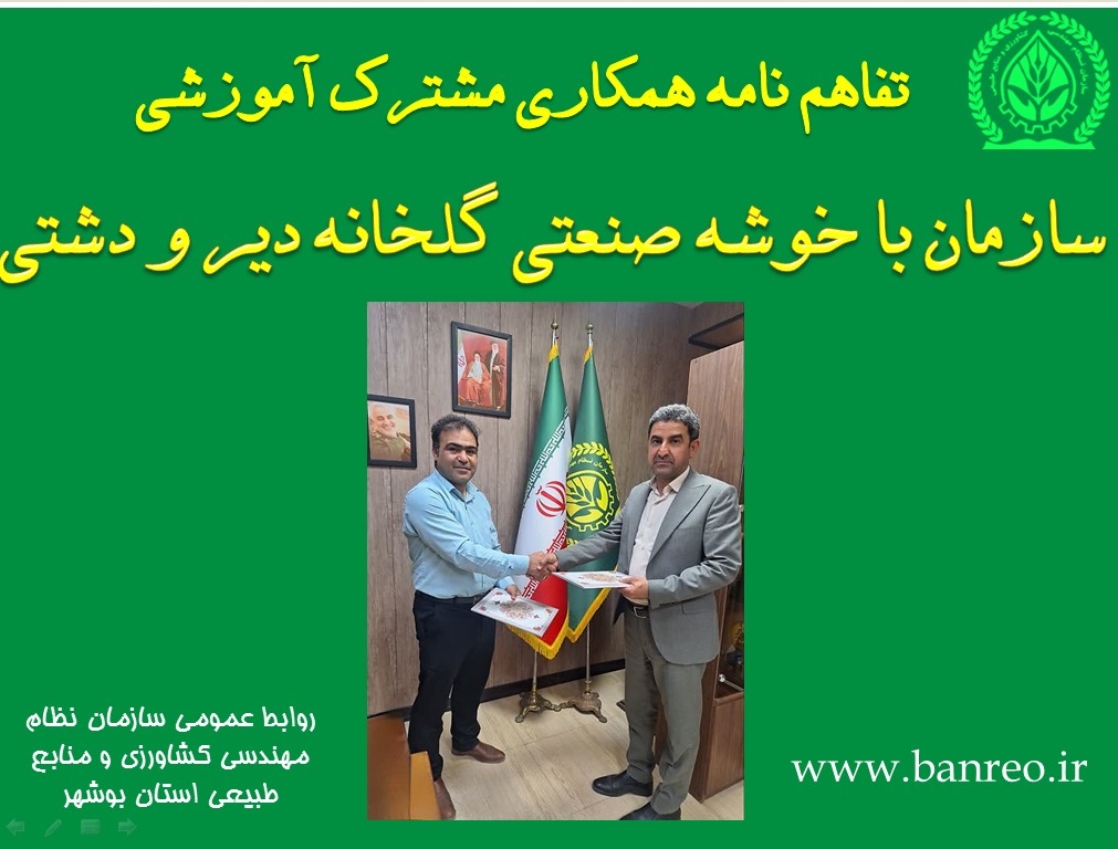 به گزارش روابط عمومی سنم استان، در راستای اهداف و وظایف سازمان نظام مهندسی کشاورزی و منابع طبیعی مبنی بر اشاعه دانش و اطلاعات کشاورزی در محیط های کشاورزی، تفاهمنامه همکاری مشترک آموزشی با خوشه صنعتی گلخانه دیر و دشتی امضاء شد.