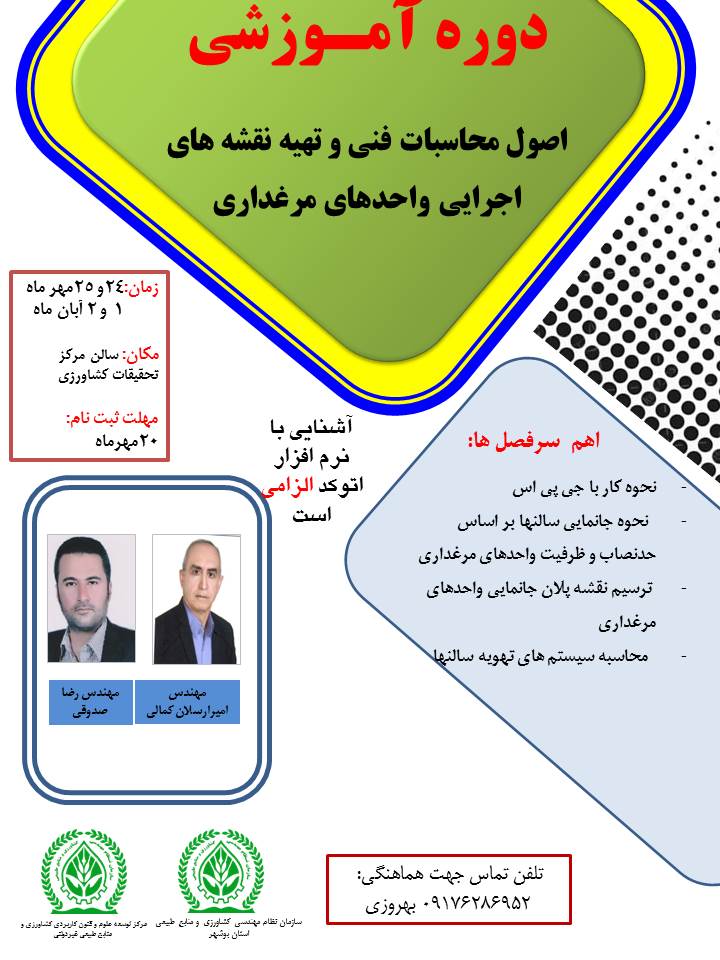 به گزارش روابط عمومی سنم استان دوره آموزشی اصول محاسبات فنی و تهیه نقشه های اجرایی واحدهای مرغداری توسط سازمان نظام مهندسی کشاورزی و منابع طبیعی استان بوشهر برگزار می گردد.