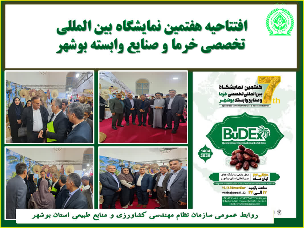 به گزارش روابط عمومی سنم استان هفتمین نمایشگاه بین المللی تخصصی خرما و صنایع وابسته بوشهر گشایش یافت ، این نمایشگاه تا ۲۳ آبانماه هرروز از ساعت ۱۷ تا ۲۲ پذیرای بازدید کنندگان، فعالان اقتصادی و علاقه مندان خواهد بود.