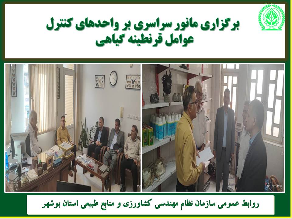 به گزارش روابط عمومی سنم استان بوشهر در راستای صیانت از حقوق عامه، حفظ و ارتقای امنیت غذایی، اولین مانور نظارت بر واحدهای کنترل عوامل قرنطینه گیاهی همزمان با سراسر کشور در سطح استان با حضور دکتر خسرو درویشی رئیس سازمان نظام مهندسی کشاورزی و منابع طبیعی استان بوشهر برگزار شد .
