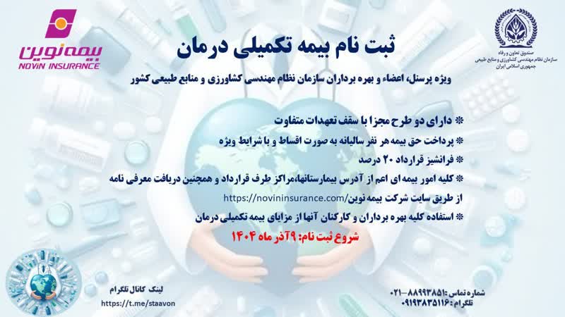 توسط صندوق تعاون و رفاه سازمان مرکزی ثبت نام بیمه تکمیلی درمان 1405-1404 شروع شد:ویژه پرسنل اعضاء و بهره برداران سازمان نظام مهندسی کشاورزی و منابع طبیعی کشور دارای دو طرح مجزا با سقف تعهدات متفاوت پرداخت حق بیمه هر نفر سالیانه بصورت اقساط و با شرایط ویژه فرانشیز قرارداد ۲۰ درصد کلیه امور بیمه ای اعم از آدرس بیمارستان ها، مراکز طرف قرارداد و همچنین دریافت معرفی نامه از طریق سایت شرکت بیمه نوین استفاده کلیه بهره برداران و کارکنان آنها از مزایای بیمه تکمیلی درمان با ارائه مدارک شروع ثبت نام : 09 آذرماه 1404