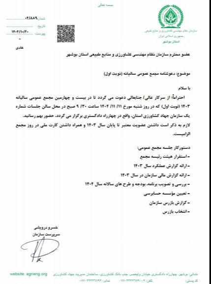 عضو گرامی سازمان نظام مهندسی کشاورزی و منابع طبیعی استان بوشهر از شما دعوت می گردد در بیست و چهارمین مجمع عمومی سالیانه 1403(نوبت اول) در تاریخ 11 بهمن ماه 1404 ساعت 9:30 صبح در سالن شماره یک سازمان جهاد کشاورزی برگزار می گردد؛ حضور بهم رسانید. |